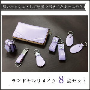 ![]() | ランドセルリメイク 8点セット | 1. ラウンド型長財布 2. ミニミニランドセルキーホルダー 3. スタンダードキーホルダー 4. 靴ベラキーホルダー 5. 肩ベルトキーホルダー(2点) 6. 楕円キーホルダー(2点) | 19,800円 | ランドセルの革を最大限に活用し、 合計8点ものアイテムが作れる充実セット。 長財布がメインに含まれるため、長く使える実用性が魅力。 |